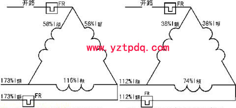 三角形接法的電動(dòng)機(jī)在滿載運(yùn)行時(shí),如果一相斷電,則其余兩根電源線中的線電流約為額定電流的173%,熱繼電器能動(dòng)作,可以起到斷相保護(hù)作用。如果電動(dòng)機(jī)在55%—67%額定負(fù)載下運(yùn)行,電源一相斷電(見圖左),這時(shí)兩相繞組的電流為38% 額定線電流。一相繞組的電流為74%額定線電流,大于原額定相電流(58%I額),這相繞組的過電流為: