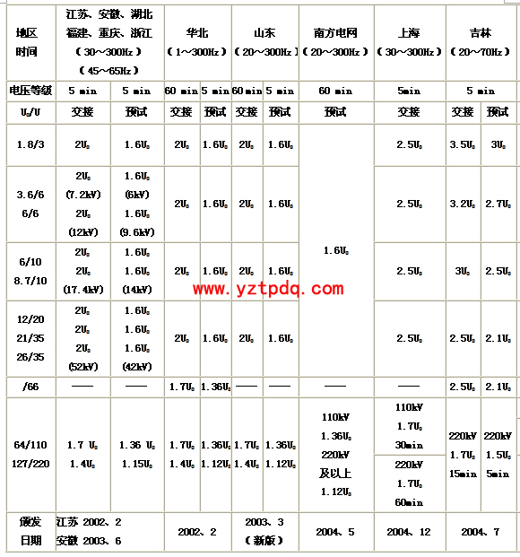 國內(nèi)部分地區(qū)(省)試驗(yàn)電壓標(biāo)準(zhǔn)