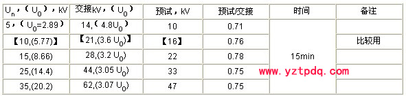 1、綜合國(guó)外和國(guó)內(nèi)采用的標(biāo)準(zhǔn),在Un=60kV以下的中壓電纜(3~35kV)其交接試驗(yàn)電壓均為2U0,預(yù)試電壓用0.8×2U0=1.6U0。深入分析,可見(jiàn)交接和預(yù)試電壓的具體值是偏低的。它適宜于發(fā)現(xiàn)(擊穿)有絕緣缺陷和存在問(wèn)題的電纜絕緣。例如:10kV電纜的交接試驗(yàn)電壓2U0=17.4kV,預(yù)試僅為14kV,比最高工作線電壓Um=11.5kV高出不多。這樣的電壓是不能用來(lái)檢測(cè)正常絕緣的絕緣水平的。因?yàn)檎=^緣的絕緣水平相當(dāng)高,新電纜的出廠交流耐壓也是很高的。