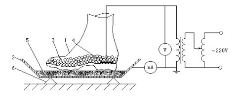 1一被試靴;2一金屬盤(pán);3一金屬球;4一金屬片