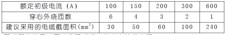 3、初級電流為100A~600A時,初級繞組穿心匝數(shù)和導(dǎo)線截面積按下表選擇: