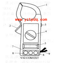 1-鉗頭2-鉗頭扳機(jī)3-保持開(kāi)關(guān)4-旋轉(zhuǎn)開(kāi)關(guān)5-顯示器6-絕緣測(cè)試附件接口7-公共地端8-電壓電阻輸入端9-手提帶