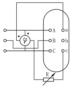 試驗(yàn)時(shí),相位表的電壓線圈按圖所示極性接于被試品的高壓,電流線圈通過(guò)一個(gè)可變電阻接入被試品低壓的對(duì)應(yīng)端子上。當(dāng)被試變壓器高壓通入三相交流電壓時(shí),在其低壓感應(yīng)出一個(gè)一定相位的電壓。由于介入法人是一個(gè)電阻負(fù)荷,所以低壓側(cè)電流和電壓同相位。因此可以認(rèn)為高壓電壓對(duì)低壓電流的相位就等于高壓電壓對(duì)低壓電壓的相位,根據(jù)相位表所測(cè)得的相位差即可知高、低壓間的時(shí)鐘序號(hào)即聯(lián)接組標(biāo)號(hào)。使用相位表法測(cè)量時(shí),應(yīng)注意以下問(wèn)題: