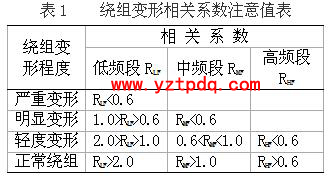 相關(guān)系數(shù)是表明兩條曲線波峰或波谷分布位置及分布數(shù)量變化的量化參數(shù),直觀地描述了頻響曲線之間的相似程度。數(shù)值越大表明兩條曲線重合度越好,越小表明重合度越差,它是判斷繞組是否變形的主要數(shù)值判據(jù)。變壓器繞組變形測試儀對相關(guān)系數(shù)的規(guī)定見表1,在實(shí)際應(yīng)用中我們發(fā)現(xiàn)其高頻段相關(guān)系數(shù)受外界影響較大,高頻段相關(guān)系數(shù)僅供參考。