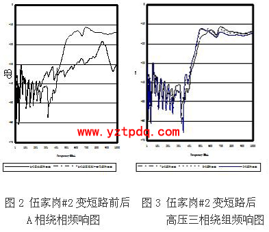2) 2004年6月14日,雨天,110KV伍家崗變電站10KV宜12開關(guān)線路因樹障產(chǎn)生鐵磁諧振過電壓造成2#主變10KV側(cè)開關(guān)相間閃絡(luò)并發(fā)生爆炸,保護(hù)正確動作跳2#主變?nèi)齻?cè)開關(guān)。該變壓器2003年11月曾做過繞組變形試驗(yàn),留存了原始頻響曲線,因此可以做縱向分析。中低壓繞組低段段相關(guān)系數(shù)都大于2,中頻段都大于1,認(rèn)為中低壓繞組未出現(xiàn)變形。高壓繞組高頻部分相關(guān)系數(shù)大于2,但中頻相關(guān)系數(shù)小于1,分別為0.42、0.44、0.41,圖2為A相頻響圖。如果僅從相關(guān)系數(shù)上來判斷,就會得出高壓繞組已出現(xiàn)明顯變形的結(jié)論。中頻段波分布電感和分布電容的變化都會使波峰和波谷出現(xiàn)位移。為了確認(rèn)我們的結(jié)論,加做了短路阻抗試驗(yàn),因試驗(yàn)容量不夠,我們未做中壓對低壓短路阻抗值,高壓對低壓繞組的三相電抗值和高壓對中壓繞組的三相電抗值分別相差0.6%、0.12%,短路阻抗與銘牌值也無大的變化,相差分別為0.2%、0.99%,短路阻抗的結(jié)果顯示未出現(xiàn)變形,這與我們頻響曲線分析的結(jié)果互相矛盾。如果高壓繞組出現(xiàn)明顯變形,會導(dǎo)致中壓繞組的分布電容出現(xiàn)一定的變化,中壓繞組的頻響曲線也會與原始曲線出現(xiàn)一定的差異,而中壓繞組頻響曲線吻合性相當(dāng)好,這也從另一個方面否定了高壓繞組明顯變形的可能。又對高壓三相繞組頻響曲線進(jìn)行橫向分析:2003年11月的高壓繞組三相頻響曲線中頻段相關(guān)系數(shù)分別為2.08、1.99、1.89,短路后三相繞組中頻段相關(guān)系數(shù)為1.68、1.75、1.45,一致性也相當(dāng)好(圖3為三相橫向比較頻響圖),這也使我們更加堅(jiān)信高壓繞組未出現(xiàn)變形,畢竟三相同時(shí)出現(xiàn)變形的機(jī)率太小。這三點(diǎn)分析都認(rèn)為高壓繞組未出現(xiàn)變形,再考慮到短路后三相差動保護(hù)動作,電氣試驗(yàn)情況良好,色譜數(shù)據(jù)正常,因此下出了高壓繞組未出現(xiàn)變形的結(jié)論。該變壓器投運(yùn)后安全運(yùn)行至今,多次的色譜追蹤也顯示該變壓器無異常,這說明當(dāng)初的分析和判斷是正確的。