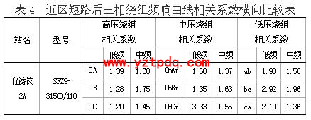 3) 在用頻率響應(yīng)法判斷繞組是否存在變形時(shí),以頻響曲線與歷史曲線縱向比較為主要依據(jù),相關(guān)系數(shù)好(波峰和波波谷無位移)說明繞組未變形,如果相關(guān)系數(shù)不好,必須輔以阻抗電壓法加以驗(yàn)證,并參考三相繞組頻響曲線進(jìn)行橫向比較。在阻抗電壓變化高于4%時(shí),表明變壓器繞組已發(fā)生嚴(yán)重變形,應(yīng)該立即退出運(yùn)行;阻抗電壓變化高于2%時(shí)應(yīng)引起足夠的重視。