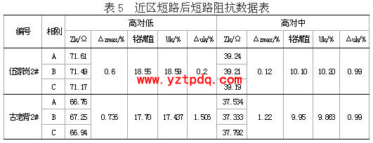 3) 2004年12月8日,雨天,10KV黃磷二回古21開關(guān)因線路接地,產(chǎn)生過電壓,導(dǎo)致10KV母線短路,古老背2#主變差動速斷動作,2#主變?nèi)齻?cè)開關(guān)跳閘。當(dāng)天我們進(jìn)行了繞組變形試驗(yàn),通過與歷史曲線對比,我們發(fā)現(xiàn)中低壓側(cè)頻響曲線一致性相當(dāng)好,但高壓繞組A相高頻段相關(guān)系數(shù)為1.33,分析頻響圖譜發(fā)現(xiàn)相關(guān)系數(shù)不好的原因不是波峰波谷的變化,而是A相繞組在2K頻率下幅值比歷史曲線低。短路阻抗測試結(jié)果顯示高壓對低壓三相繞組電抗值相差僅0.736%,高壓對低壓繞組短路阻抗與銘牌值相比,相差1.506%,高壓對中壓短路阻抗值與銘牌值相差0.99%,見表5。直流電阻測量也顯示無匝間或?qū)娱g短路。該變壓器原為無載調(diào)壓變壓器,在城網(wǎng)改造中進(jìn)行過無載改有載改造,將高壓中性點(diǎn)解開,拆分為X、Y、Z后外加三只套管引出,通過三根跳線引至調(diào)壓變壓器。試驗(yàn)時(shí)因雨未將架空線與X、Y、Z三只套管解開,而是直接將架空線與調(diào)壓變的聯(lián)結(jié)解開,這樣A 相繞組尾端末懸空并連有約2m長的跳線。2K頻率下繞組響應(yīng)幅值比歷史曲線下降的原因在于引線未拆除。 引線感應(yīng)電壓的影響(1#主變?nèi)栽谶\(yùn)行,相距約4米)、引線與高壓A相套管的接觸不良均會造成此現(xiàn)象發(fā)生。因此我們下出高壓繞組A相無變形的結(jié)論,目前該變壓器一直安全運(yùn)行。
