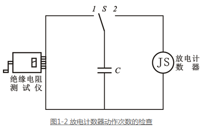 為了檢查放電計數(shù)器動作是否正常,一種方法是用沖擊電流發(fā)生器給計數(shù)器加一個幅值大于100A的沖擊電流,看其是否動作。圖1-2示出了一種適宜現(xiàn)場采用的簡易試驗方法。用一個1000V或2500V絕緣電阻測試儀給一個電容量約為5~10μF的電容器充電,然后用電容器通過放電計數(shù)器放電,計數(shù)器應(yīng)當(dāng)動作。試驗時應(yīng)注意: