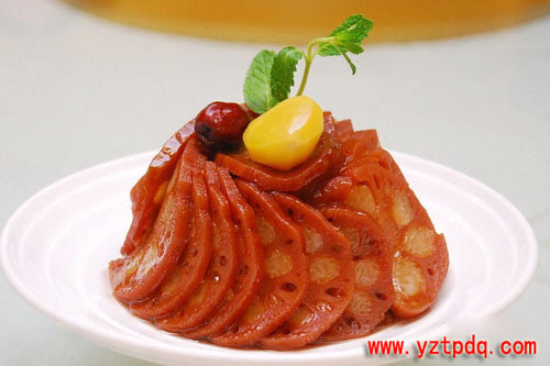 蜜餞捶藕為揚州寶應十大名菜之首,曾載入清宮御食譜。它是用荷藕、糯米、蜜餞、白蓮為主原料,配以青梅、桔餅、蜂蜜等佐料,經(jīng)燜、拍、炸、蒸等10多道工序制作而成。它色澤醬紅,香甜酥爛,素而不淡,濃而不膩,有健脾開胃、生津止渴、減肥降壓、益腎固精之功效。藕片軟糯,食之香甜不膩。