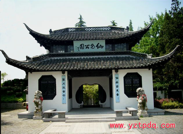 門(mén)廳與牌坊同處一條中軸線上,形為如意,游客一入園,即游園如意。進(jìn)門(mén)廳先是一小園,園中,以太湖石依地勢(shì)堆疊成花臺(tái),幾株翠竹點(diǎn)綴其間,恰到好處。園門(mén)—亡古篆“游仙”二字映入眼簾。進(jìn)入園門(mén),西部五疊泉,一支“玉液”從假山頂端跌落,出水處似為龍頭。水流不斷,水濺石響,如聞琴韻,泉旁山黃樹(shù)綠,溪旁仙女雕像亭亭玉立,淡裝,素裹,冰清玉潔。溪邊綠柳吻水,花木蔥蘢,把仙女映襯得楚楚動(dòng)人。