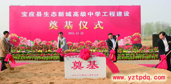 寶應(yīng)縣委、縣政府11月12日上午隆重舉行生態(tài)新城高級(jí)中學(xué)工程建設(shè)奠基儀式,寶應(yīng)縣領(lǐng)導(dǎo)仲生、王庭國(guó)、秦有芳、侯承海、朱宋華、楊善慧,楊洪國(guó)、楊步云等出席并為工程奠基培土。