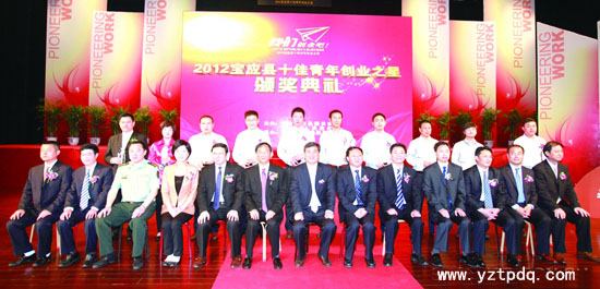 頒獎(jiǎng)典禮結(jié)束前,寶應(yīng)縣領(lǐng)導(dǎo)上臺(tái)與2012“寶應(yīng)縣十佳青年創(chuàng)業(yè)之星”獲獎(jiǎng)?wù)吆嫌傲裟睢?br />