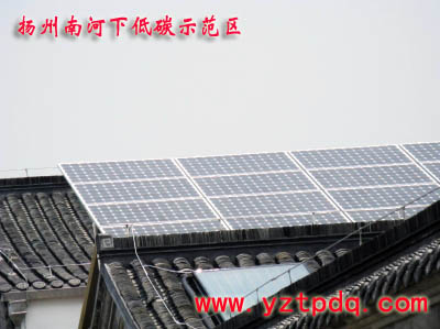 昨天上午,記者在南河下低碳示范區(qū)內(nèi)看到,戶外路燈已經(jīng)安裝結(jié)束。項(xiàng)目負(fù)責(zé)人介紹,這些路燈都是采用的節(jié)能燈,電源全部來自太陽能光伏板發(fā)電。項(xiàng)目負(fù)責(zé)人將記者帶進(jìn)項(xiàng)目展示區(qū)的3號(hào)樓二樓平臺(tái),兩名技術(shù)人員正在平臺(tái)一個(gè)“人”字頂上安裝光伏板,光伏板面積為10多平方米。“光伏板分別安裝在3號(hào)樓和11號(hào)樓平臺(tái)上,共有24塊板子,總發(fā)電能力為4.32千瓦。”該項(xiàng)目負(fù)責(zé)人介紹,整個(gè)路燈的供電全部依賴上述太陽能發(fā)電。