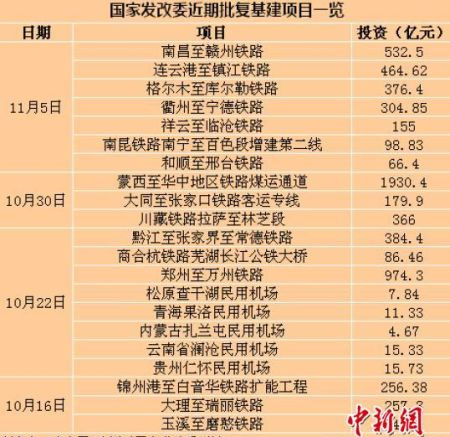 至此,在10月16日到11月5日的21天時(shí)間里,發(fā)改委至少批復(fù)了上述16條鐵路和5個(gè)機(jī)場項(xiàng)目,這21個(gè)基建項(xiàng)目總投資約6933.74億元。