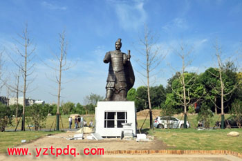 據(jù)施工人員介紹,吳王夫差雕塑設(shè)置在廣場東西中軸線的西端,材質(zhì)為青銅,基座高度約2.5m,雕塑高約6m,總體高度約8.8m。據(jù)工程負(fù)責(zé)同志介紹,吳王夫差雕塑今年5月13日確定了中標(biāo)供應(yīng)商,中標(biāo)供應(yīng)商在吸納評標(biāo)專家和部分揚州文史專家的意見后,對雕塑的造型、服飾、面部神態(tài)等細(xì)節(jié)進(jìn)行了完善。據(jù)悉,這次先行吊裝的為1:1的玻璃鋼雕塑,重約1噸。為什么不直接吊裝青銅雕塑?專家告訴記者,這是想經(jīng)過一定時間的現(xiàn)場展示,來征集市民的意見,在征集市民意見截止之日起60天內(nèi),完成最終的青銅雕塑制作和現(xiàn)場安裝。