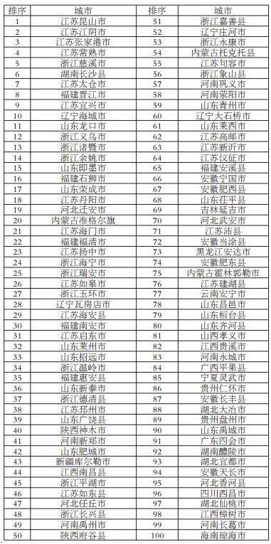 在外界一直較為關(guān)注的綜合實力百強縣市榜單中,江蘇、山東、浙江成為“百強縣”集中地,分別占有20席、15席、14席。全國前十強為:江蘇昆山市、江蘇江陰市、江蘇張家港市、江蘇常熟市、浙江慈溪市、湖南長沙縣、江蘇太倉市、福建晉江市、江蘇宜興市、遼寧海城市。
