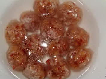 做藕粉圓子首先是制作圓子餡。將花生仁、芝麻仁、核桃仁炒熟焙干分別碾成細(xì)末。將紅棗或大棗煮爛去皮,加糖熬成糖泥后,分別與上述三種仁末同拌,做成小丸,成花生、芝麻、核桃餡料丸。將干藕粉散放在竹匾內(nèi),取丸餡在匾中滾動(dòng),粘上藕粉,取出,噴灑上微水,再入藕粉匾中滾過,再取出,再噴水,再滾過,直至藕粉圓子坯大小適當(dāng)為好。也有人將圓子生坯沸水內(nèi)一過,再入匾中滾藕粉增大。后者方法做圓子雖快,但圓子表面粗糙,大小也難以一致。做藕粉圓子的高手所做出的藕粉圓子看上去大小一樣,表面光滑,賞心悅目。吃到口里是軟、綿、糯、香。下藕粉圓子并不復(fù)雜,和下普通圓子基本相似。鍋內(nèi)藕粉圓子在沸湯中浮起后,再加入一點(diǎn)冷水,再待湯沸鍋中的圓子全部上浮,呈半透明狀,圓子起暗紅色,即可用漏勺撈出盛到配有桂花糖鹵的碗中上席。
