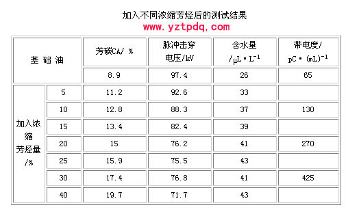 (4) 在表2可知,油的帶電度隨加入芳烴的含量增加而升高,這與油的結(jié)構(gòu)族變化有關(guān)。另外,將基礎(chǔ)油和加入濃縮芳烴后滿足析氣性要求的“超高壓油”分別在125℃的烘箱中氧化13 h后,測(cè)得基礎(chǔ)油的帶電度增加約250 pC/mL,而“超高壓油”增加約500 pC/mL。這與抗氧化性能變差的結(jié)果相一致。