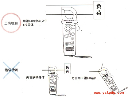 ?、郯聪掳鈾C(jī)打開(kāi)鉗口,鉗住一根導(dǎo)線,如果鉗住兩根以上,測(cè)量無(wú)效。