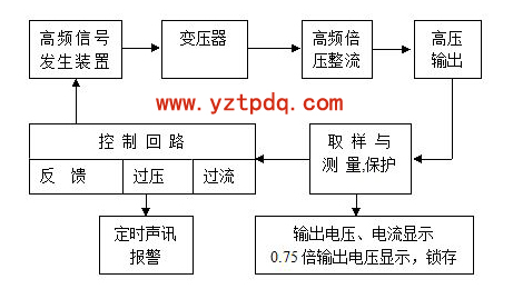高壓直流發(fā)生器應(yīng)用電力電子技術(shù),采用先進(jìn)的PWM調(diào)制技術(shù)及大功率MOSFET器件,通過中頻倍壓整流而成;該設(shè)備具有紋波系數(shù)小、輸出穩(wěn)定可靠,體積小、重量輕的特點(diǎn),且具有可靠、靈敏的內(nèi)部保護(hù)功能,其原理框圖如圖所示。