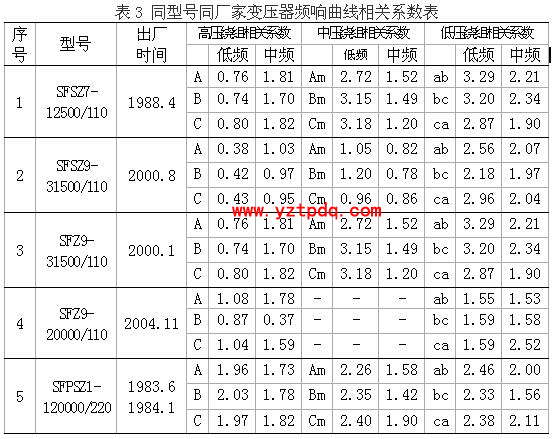 7) 同型號同廠家變壓器頻響曲線相關(guān)系數(shù)分析:對宜昌電網(wǎng)中5種型號的10臺變壓器(其中220KV變壓器2臺,110KV變壓器8臺)相關(guān)系數(shù)分析,發(fā)現(xiàn)同型號變壓器低壓側(cè)對應(yīng)繞組頻響曲線一致性明顯好于中高壓側(cè)繞組,高壓側(cè)一致性最差。具體數(shù)據(jù)見表3,原因在于:一,高壓套管位置較高,受感應(yīng)電壓影響較大;二是引線與套管之間的雜散電容的影響。因此在實(shí)際判斷繞組有無變形時(shí),若無原始曲線需要與同廠同型同期變壓器測試結(jié)果相比較時(shí),應(yīng)對高中低三側(cè)繞組區(qū)別對待,高壓側(cè)繞組頻響曲線僅有參考價(jià)值。