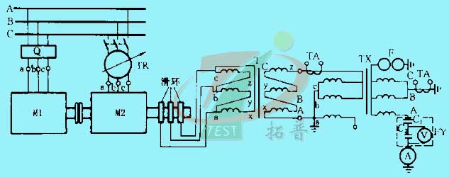 其同步發(fā)電機(jī)組基本原理接線如上圖所示。圖中,電源裝置同補(bǔ)償電抗器、中間升壓變壓器以及必要的外圍測量設(shè)備聯(lián)合使用。電源主要由三相異步電動機(jī)和無刷勵磁的中頻同步發(fā)電機(jī)組成中頻發(fā)電機(jī)組,再配以啟動、控制、測量和保護(hù)系統(tǒng)組成。其工作原理為中頻發(fā)電機(jī)發(fā)出定頻率(150Hz)的單相或三相交流電能,經(jīng)中間變壓器升壓,同時用補(bǔ)償電抗器來調(diào)整補(bǔ)償被試變壓器的電容性電流,以獲得所需的試驗(yàn)電壓。這種工作原理和方式可以得到所需頻率的試驗(yàn)電壓,電網(wǎng)電源僅用來驅(qū)動發(fā)電機(jī)組和提供直流勵磁電源,使試驗(yàn)電源與電網(wǎng)電源實(shí)現(xiàn)隔離,從而消除了試驗(yàn)回路來自電網(wǎng)系統(tǒng)的干擾,無刷勵磁方式也大大降低了電源本身的干擾水平,因此在做感應(yīng)耐壓的同時,也可進(jìn)行局部放電測量。