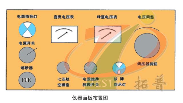 3.將儀器面板上的“電壓調(diào)整”旋鈕向左旋到底(旋不動為止),保證開機前調(diào)壓器輸出電壓為零,然后將儀器電源插頭插好,并接通儀器面板上的電源開關.此時電源指示燈(綠色)亮,直流電壓表和峰值電壓表均在另位。