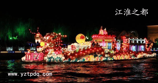 整條彩船以巨大的騰龍為主造型,采用低碳環(huán)保的青霉素玻璃空瓶作為制作的基礎(chǔ)材料,喻意江都的經(jīng)濟(jì)發(fā)展和沿江、沿運(yùn)開(kāi)發(fā)向環(huán)保型方向發(fā)展。兩側(cè)輔以兩只鳳凰,喻意江都的沿江、沿運(yùn)開(kāi)發(fā),體現(xiàn)江都“一主兩翼”的發(fā)展格局。船中央設(shè)計(jì)是一個(gè)大型的走馬花燈,展示的是江都龍頭企業(yè)的代表,經(jīng)濟(jì)發(fā)展的成就;船尾寬大古典的舞臺(tái)上,人們?cè)谳d歌載舞,隱喻江都龍川大地,是祥江之都,龍騰盛世,和諧江都。