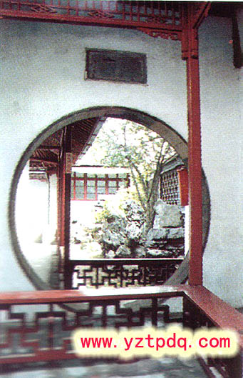 東院以回廊通連,南向植細桿梧桐,瘦長如修竹,饒有清妍之姿。經(jīng)回廊達半亭,亭欄臨水,池水由此北折,水池盡頭,有軒三間,池邊花壇上置數(shù)點峰石,小徑用鵝卵石砌鋪。游人至此,雖則地已窮盡,但隨路一轉(zhuǎn),或東登半亭,或緣池西去,達于園之西部。