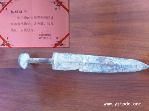 經(jīng)高郵、揚州兩地文物考古專家初步鑒定,該劍系商周時代的青銅古劍。